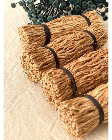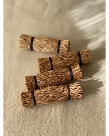 Here are 4 adorable vetiver root fagotins: join the useful to the pleasant! Indeed, the natural, very subtle, woody and green scent will perfume your wardrobe and protect your laundry from mites. Because vetiver roots contain molecules (terpenes) with insecticidal power. Efficacy : about 1 year.